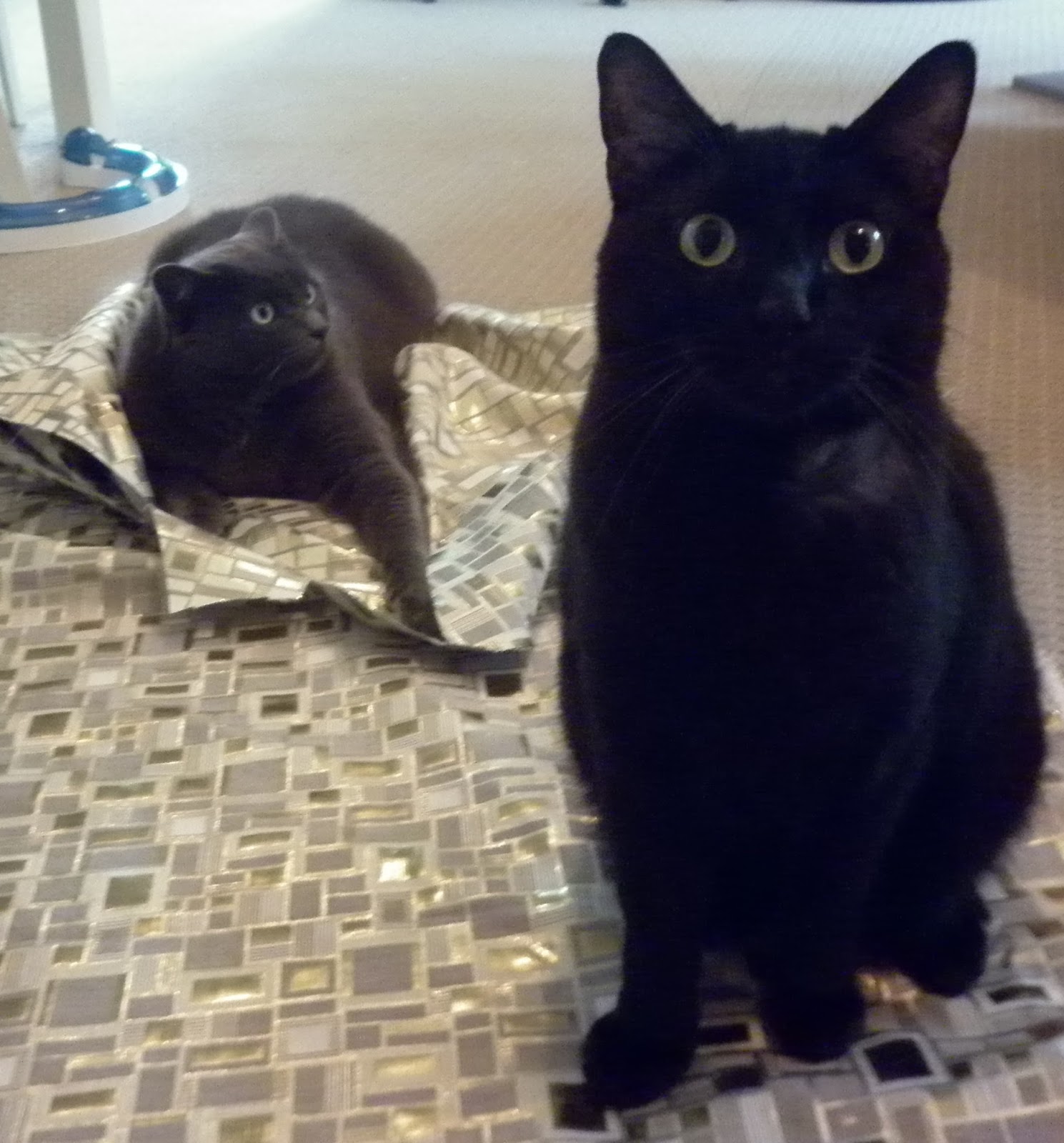 And finally my little helpers. Polly-Jean in the background obviously just straightening up my fabric before I put the pattern pieces down. And the lovely Salem who is our foster kitty. He is a very well behaved cat. I hate to think the bad habits he is learning from my angel.